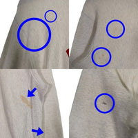 状態説明 | 全体的に使用感が感じられます。首元リブにダメージが見受けられます。右肩に穴が見受けられます。前身頃に左下、腰周りリブに茶色いシミが見受けられます。左右袖先にダメージが見受けられます。左袖にダメージが見受けられます。後身頃、左右脇、左袖にシミ汚れが見受けられます。 |