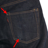 状態説明 全体的に使用感があります。腿に白い跡が見受けられます。パッチに細かいシワや剥がれが見受けられます。後ろポケットに糸の解れや白くなっている部分があります。前左ポケット裏地に糸の解れが見受けられます。
