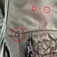 状態説明 | フード・襟・両袖に焼け跡がございます。 肩・両袖・腹部・背面中央にシミ汚れがございます。(写真参照) |